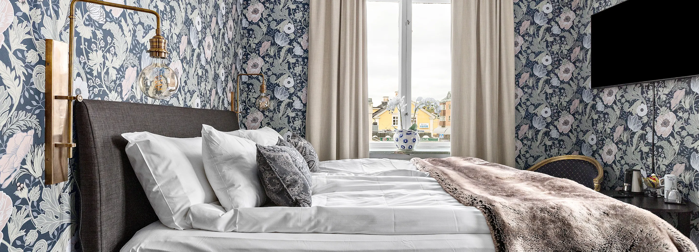 Mysigt stadshotell i Vetlanda där varje rum är unikt inrett.