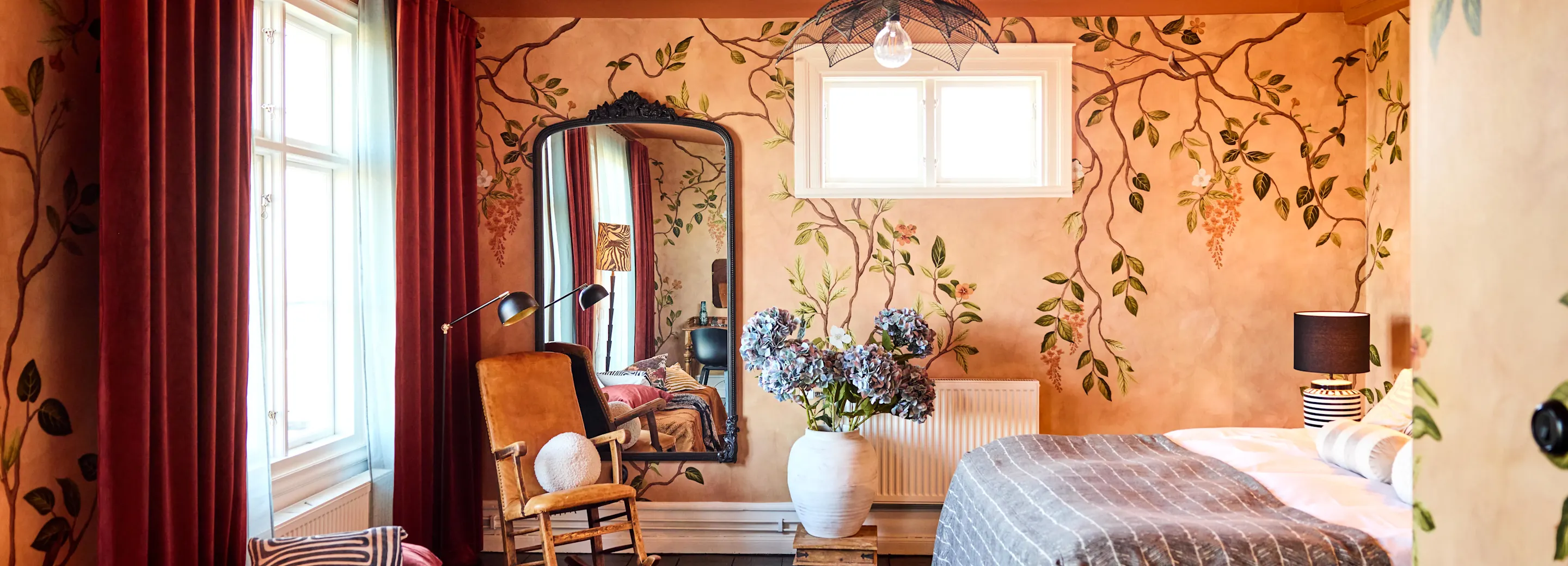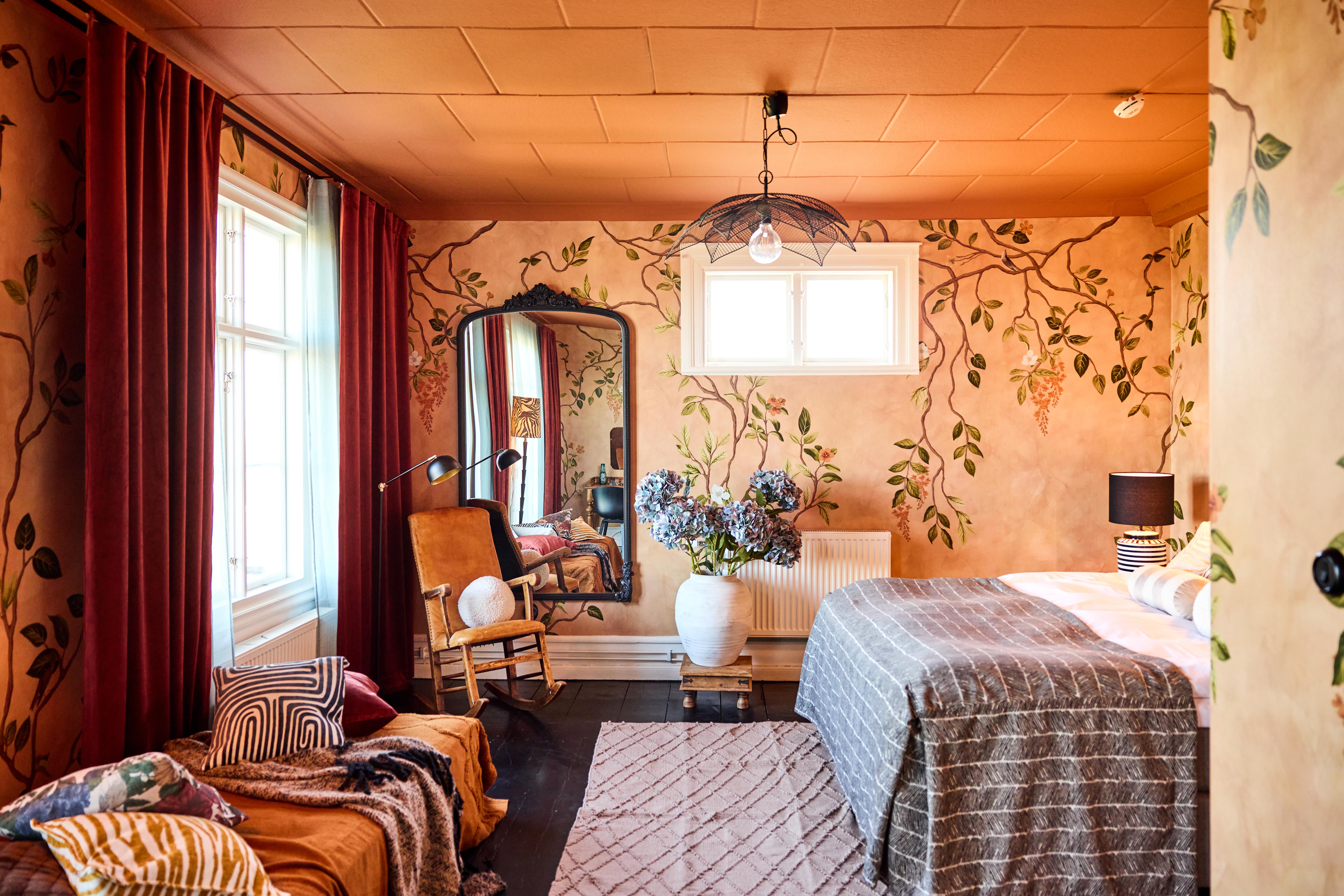 En stämningsfull juniorsvit i Helsingborg med högt i tak och varma färgtoner som ger tidlös elegans; här väntar en stor säng och en inbjudande soffgrupp, i rum hållna i rosa, blå eller mörkgröna nyanser.